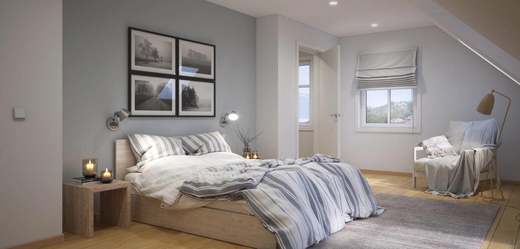 I andre etasje finner du en hyggelig loftstue og hele fire soverom, to av dem med utgang til egen balkong, og det største soverommet har også eget walk-in-closet. Det ene soverommet kan også brukes som lekerom eller oppholdsrom, om du ikke har behov for så mange soverom. Det er også et stort og flott bad på dette planet.