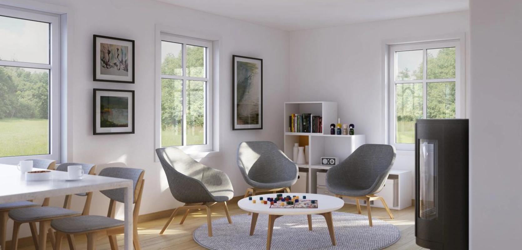 Inne i boligen gir den fleksible planløsningen deg muligheten til å realisere dine innredningsideer. Vinkelstuen gir rikelig med plass til å utfolde seg. Hvis du ønsker en allromløsning, kan kjøkkenveggen flyttes mot pipen.